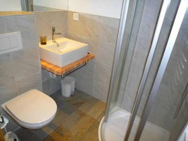 Grande salle de bain avec baignoire 2 places et toilette ainsi qu'une machine à laver le linge